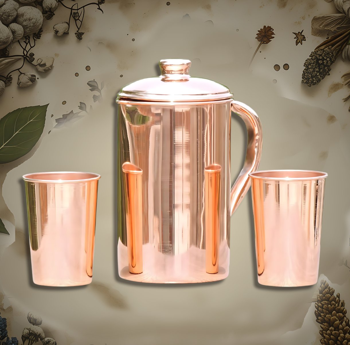 This copper water pitcher set is inspired by ancient practices where water is stored in copper to naturally interact with the metal over time. Many cultures have valued this method as part of their daily wellness rituals.